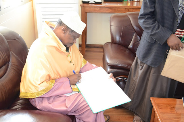 Mufti wa Tanzania ,Abubakary Zubery akitia saini katika kitabu cha ageni mara baada ya kufungua rasmi ofisi za BAKWATA wilaya ya Hai.