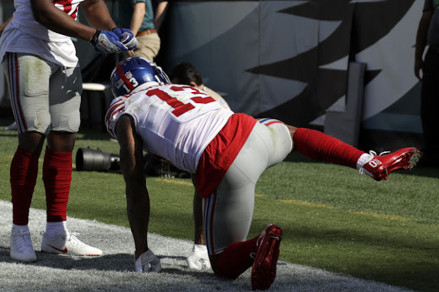 Odell Beckham Jr. caught a 10-yard touchdown pass from Eli Manning early in the fourth quarter of Sunday’s game in Philadelphia and drew an unsportsmanlike penalty for his odd celebration, before the Giants would fall in a heartbreaker, 27-24. The Giants are now an unthinkable 0-3.